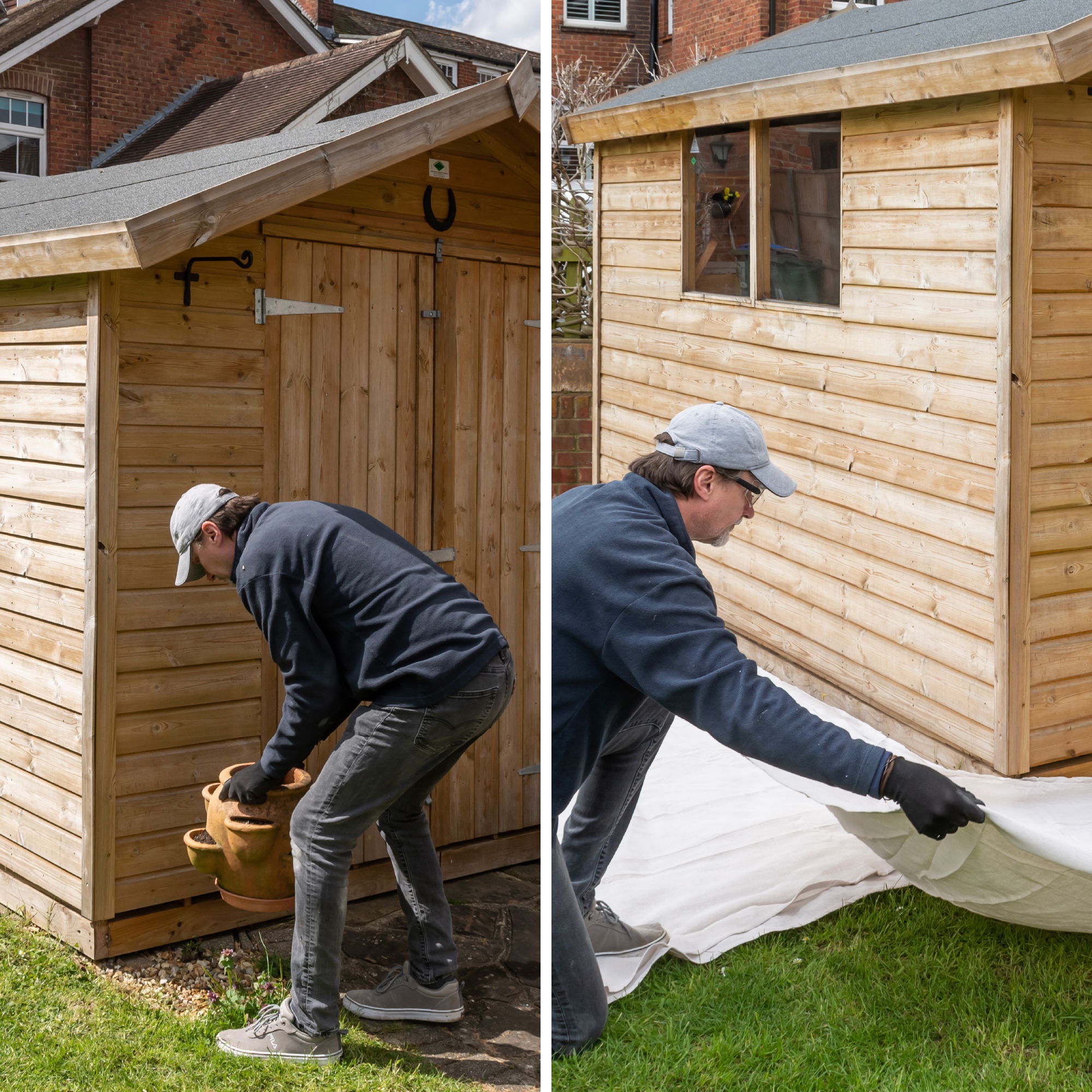 Remove any loose such as hanging baskets or pot plants. Protect the surrounding area such as grass, paving and plants with ground sheets.