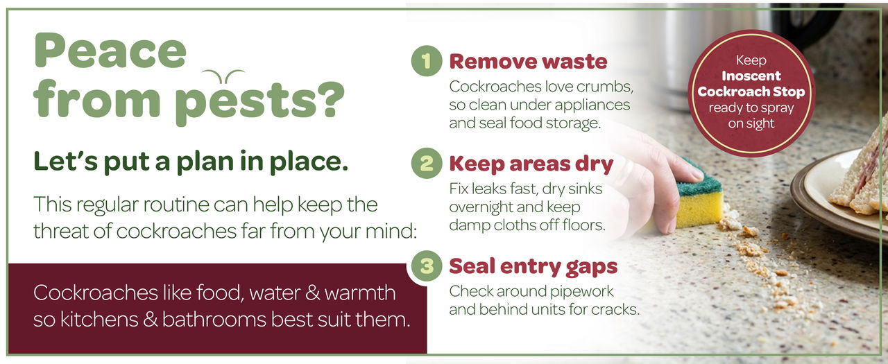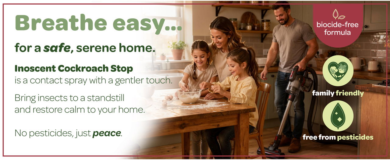 If you need cockroach treatment as part of a wider plan to get rid of cockroaches, Inoscent Cockroach Stop fits easily into a simple home routine. Keep surfaces clean, clear away food debris, empty bins regularly, fix leaks and seal cracks or entry gaps around doors, windows, pipes and cables. Used this way, this pesticide free cockroach spray offers a practical answer to how to get rid of cockroaches while helping you stay on top of repeat activity in the home. Cockroaches also cannot build up resistance to the formula’s mechanical action.