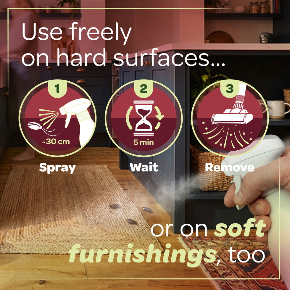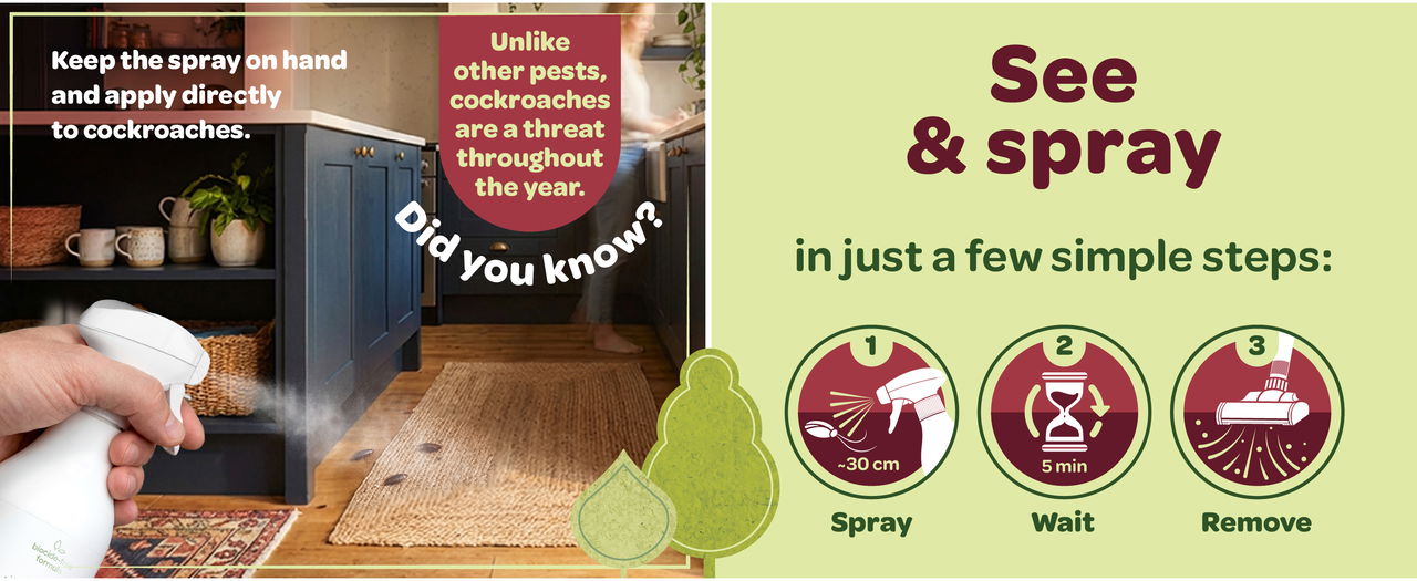 Use it as a cockroach spray indoors wherever cockroaches are seen. Spray directly onto active insects in heating ducts, behind appliances and other warm, dark spaces. It leaves no sticky or greasy residue, gets to work within 5 minutes and may need a second spray for larger cockroaches. After treatment, simply vacuum or sweep the area clean. A practical and cockroach control spray for kitchens, utility areas and other indoor problem spots.