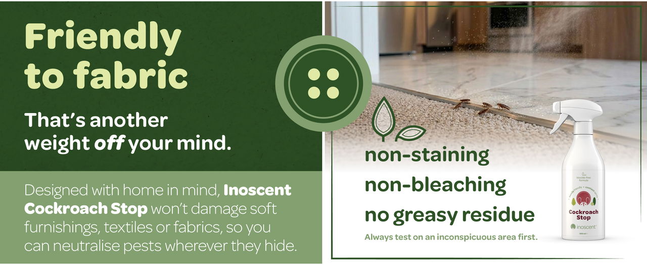 Inoscent Cockroach Stop is a ready to use, pesticide and biocide-free cockroach spray for the home. It works through mechanical action, which means that cockroaches cannot build up resistance to the formula. Friendly to fabric, Inoscent Cockroach Stop is non-staining and suitable for indoor use around the home, including spaces used by children and pets.