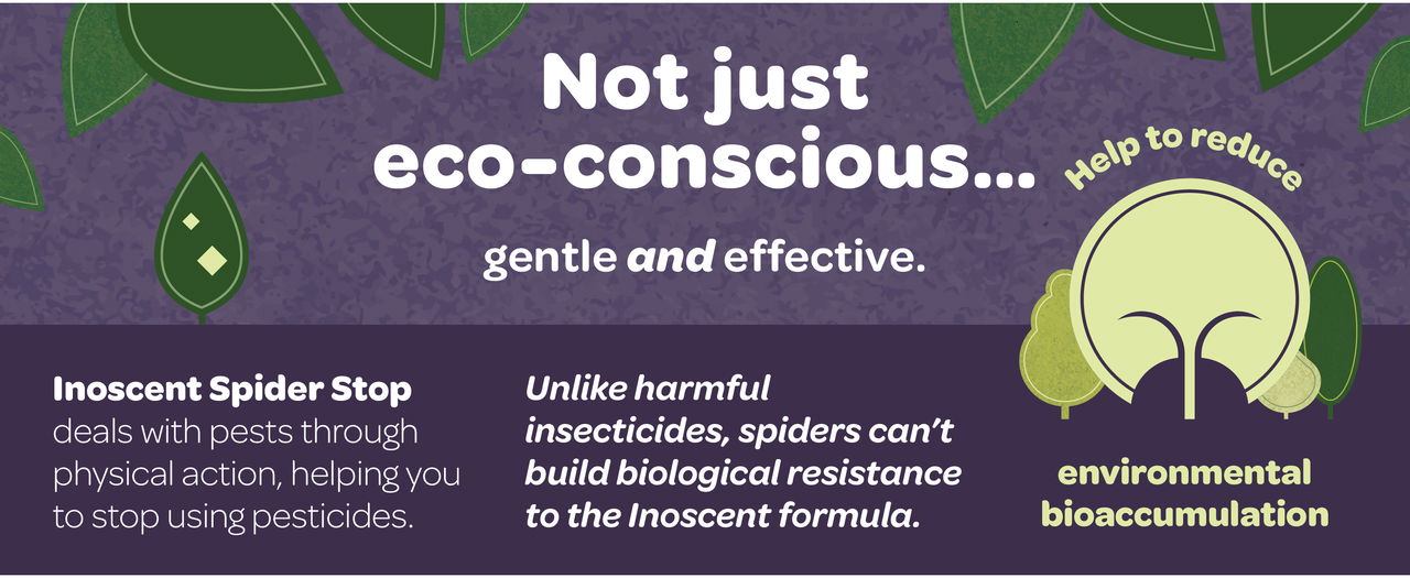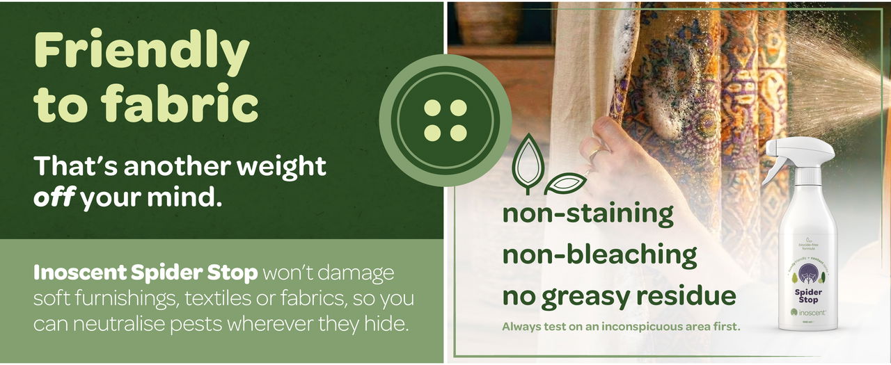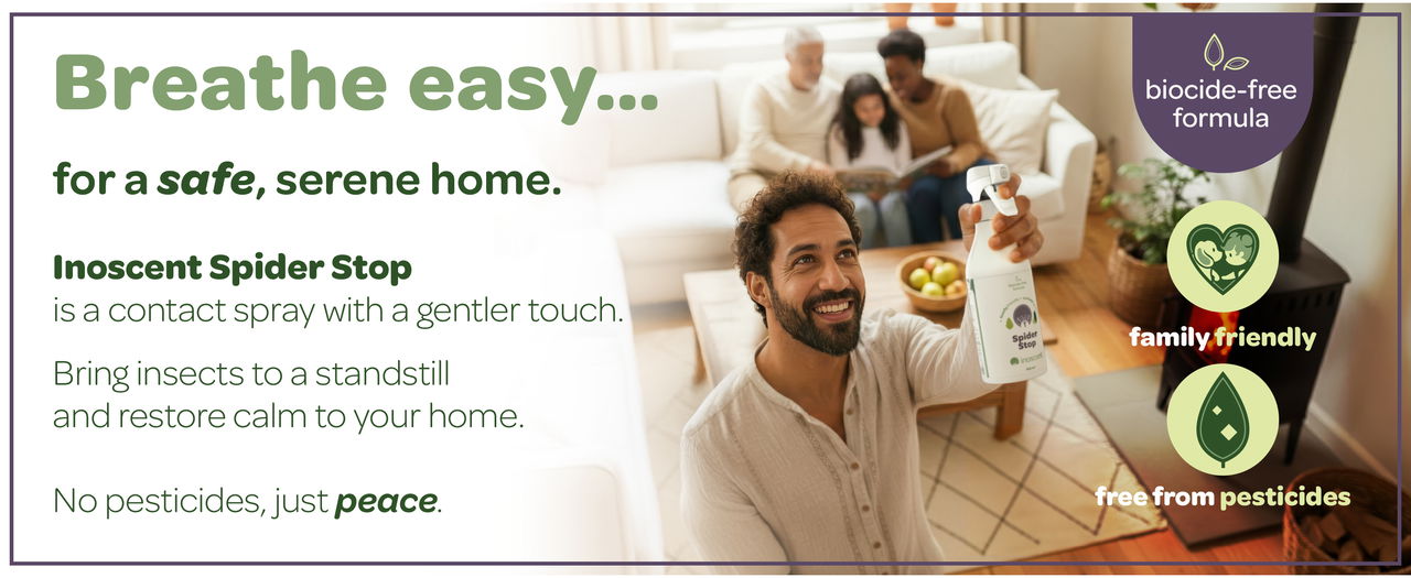 Inoscent Spider Stop is a ready to use spider spray for the home. It's a pesticide-free and biocide-free way to deal with spiders in your home, shed and garden. Unlike chemical-based sprays, spiders cannot build up resistance to Inoscent's mechanical action. Gentle formula keeps your household feeling calm and settled during treatment. The friendly to fabric formula is non-staining and leaves no sticky or greasy residue, so it suits careful indoor use around everyday living spaces.