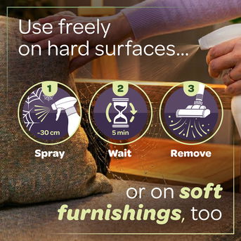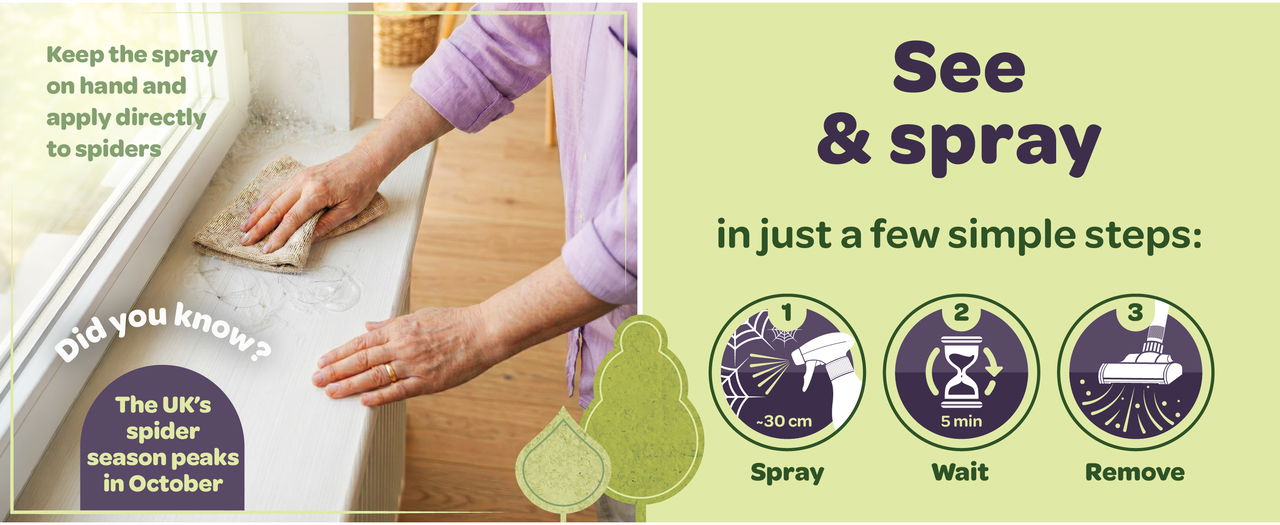Use it as a spider spray indoors wherever spiders are seen. Spray directly onto pests around skirting boards, window sills, door frames, ceiling edges and behind furniture. It can also be used in garages and sheds. The spray gets to work within 5 minutes, then you can simply vacuum or sweep the area clean. Larger spiders may need repeat sprays.