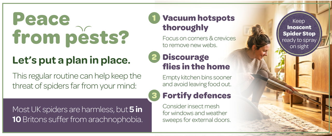 If you want to get rid of spiders without bringing harsh pesticides into the home, Inoscent Spider Stop offers a direct and easy to use option. Use as part of a wider pest control routine for maximum success. Vacuum corners and crevices thoroughly, remove webs when they appear and reduce the insects that attract spiders indoors. Used this way, this pesticide free spider spray allows you to get rid of spiders around the house and stay on top of repeat activity.