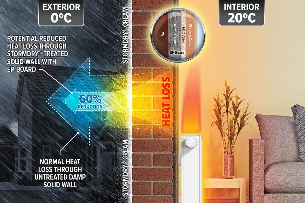 If Stormdry EP Board is applied on a previously damp solid wall that has been treated with Stormdry Masonry Protection Cream, an even bigger improvement in insulation performance and energy bill savings can be made. When used in combination the U-value of a solid wall in moved from 2.1 to 0.8 contributing to any upgrades in the properties EPC rating.